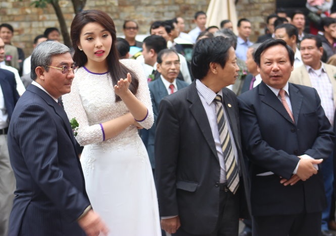 | Ông Nguyễn Văn Hùng (người đeo kính, đang nói chuyện với hoa hậu Kỳ Duyên) trong dịp khai trương khách sạn 5 sao Hai Bà Trưng ở TP.Buôn Ma Thuột (Đắk Lắk) tháng 1/2015. Ảnh: Tuổi trẻ. |