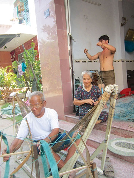 | Ông Trương Văn Trọng phụ giúp sửa lại ngư cụ của các con sau mỗi chuyến đi biển về. |