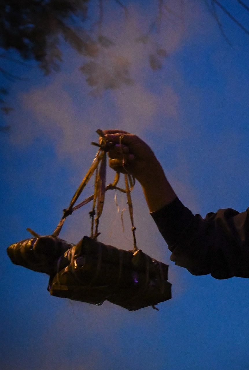 | Mọi người quây quần trông bánh kể từ đó đến hết đêm. Những đứa trẻ nướng khoai, nướng ngô, nói chuyện. Một vài thanh niên khoẻ mạnh được phân công canh lửa, thêm nước. |