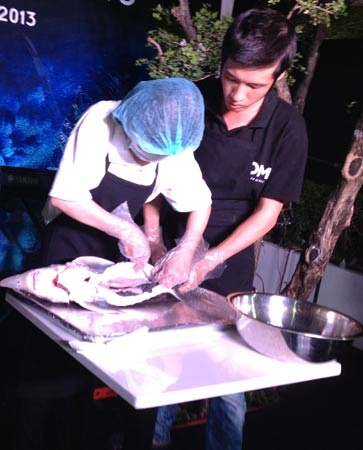 | Mổ cá tại bàn, mốt chơi của dân nghiện trứng cá tầm. |