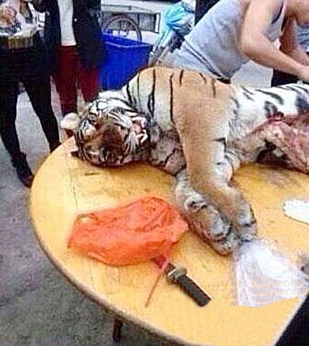 | Cảnh giết thịt hổ giữa nơi đông người do Xi Pat tổ chức. Ảnh: Daily Mail |
