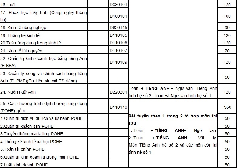 Danh sách ngành học và chỉ tiêu dự kiến:
