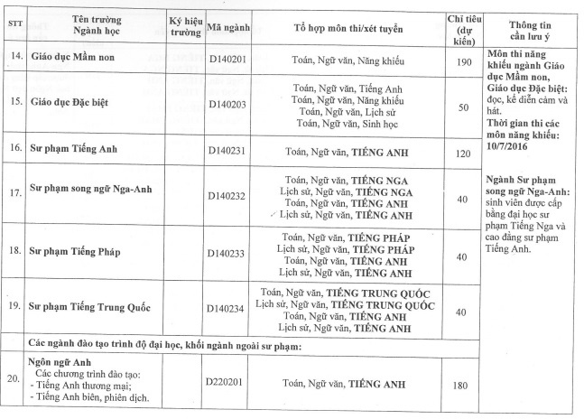 Về nội dung thi các môn năng khiếu, ngành Giáo dục thể chất gồm chạy cự ly ngắn, lực kế bóp tay, bật xa tại chỗ. Các ngành Giáo dục mầm non, Giáo dục đặc biệt: Đọc, kể diễn cảm và hát. Thời gian thi các môn năng khiếu là ngày 10/7/2016.