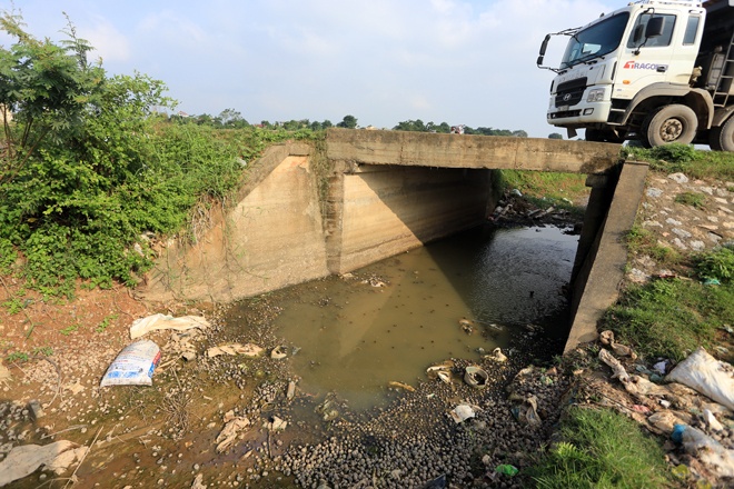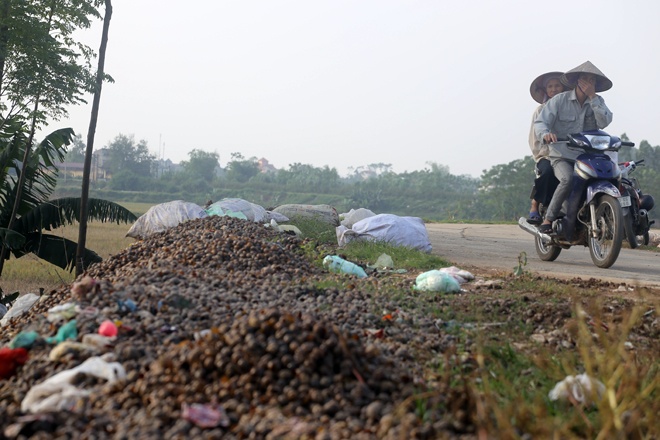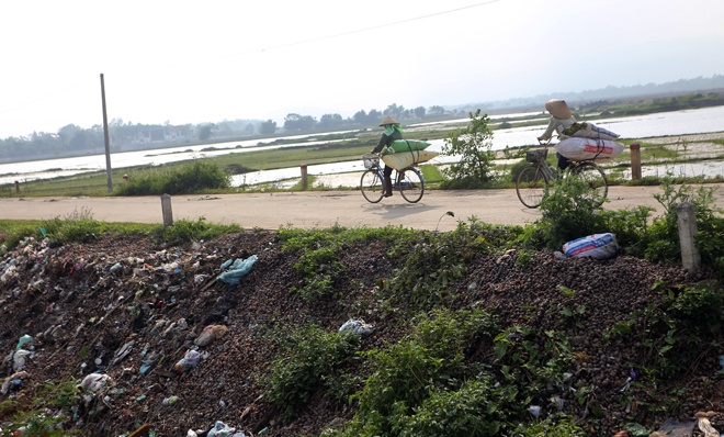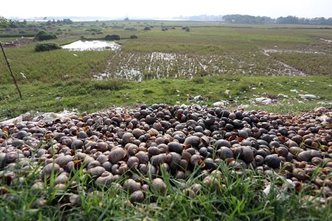 Đi qua các con đường tại xã Cấn Hữu, huyện Quốc Oai (Hà Nội) người dân đều phải đưa tay bịt miệng vì mùi hôi thối tỏa ra từ các đống vỏ ốc bươu vàng bị xả đầy ruộng và bên triền đê.