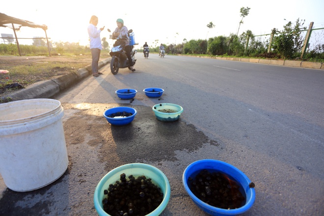 Trên đại lộ Thăng Long, nhiều người dân bán ốc bươu vàng lẫn với ốc mít và một số loại ốc khác.