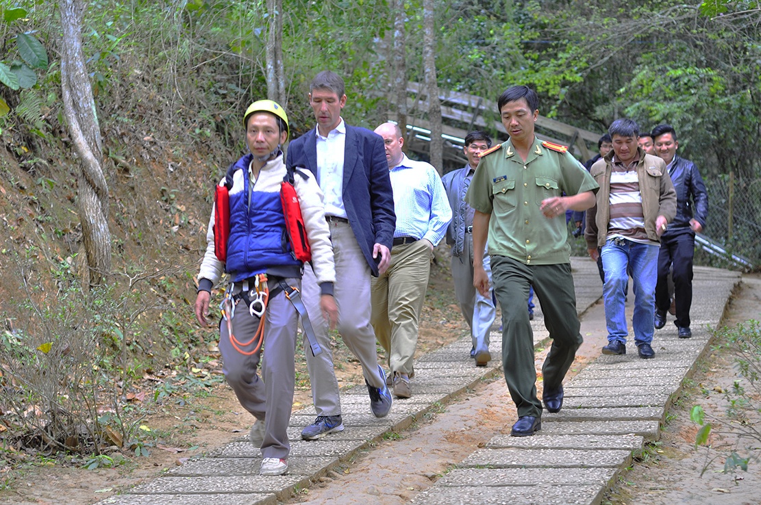 Ông Giles Lever - Đại sứ Anh (áo vest) đến khu vực thác Datanla thị sát. Ảnh: Ngọc An. |