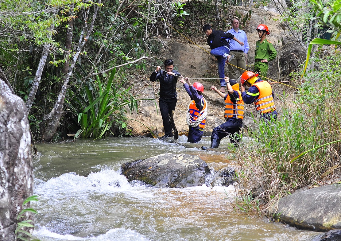 Lực lượng Công an tỉnh Lâm Đồng triển khai lực lượng dẫn dắt, chốt tại những điểm nguy hiểm tại thác để đảm bảo an toàn cho Đại sứ và đoàn công tác.