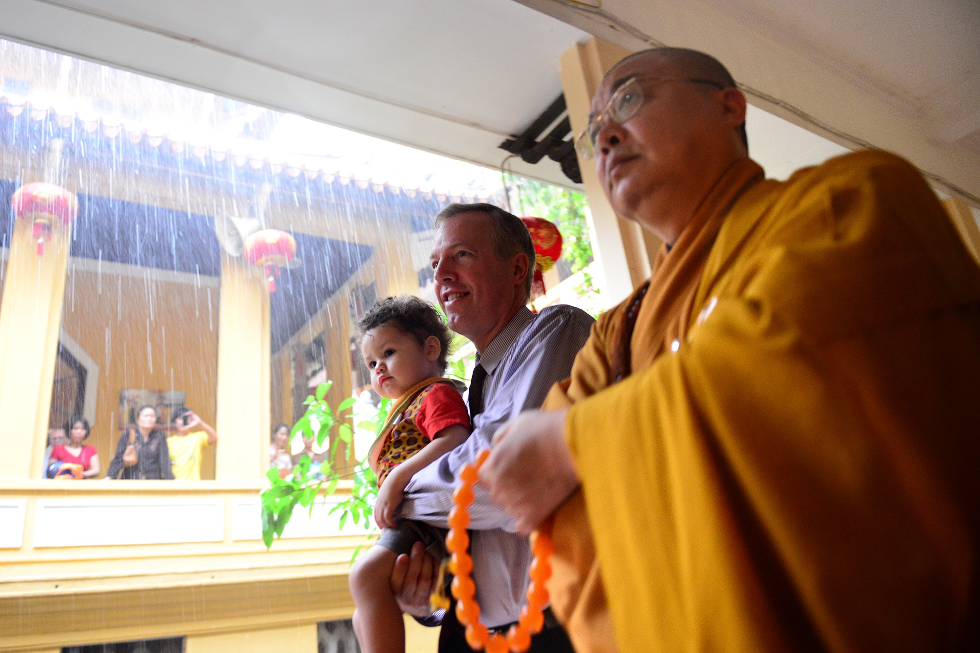 Ted Osius cùng con trai đội mưa vào chùa. Bà Nancy Zimmerman, mẹ của Đại sứ Ted Osius và chị gái Alison Osius đi cùng cha con ông.