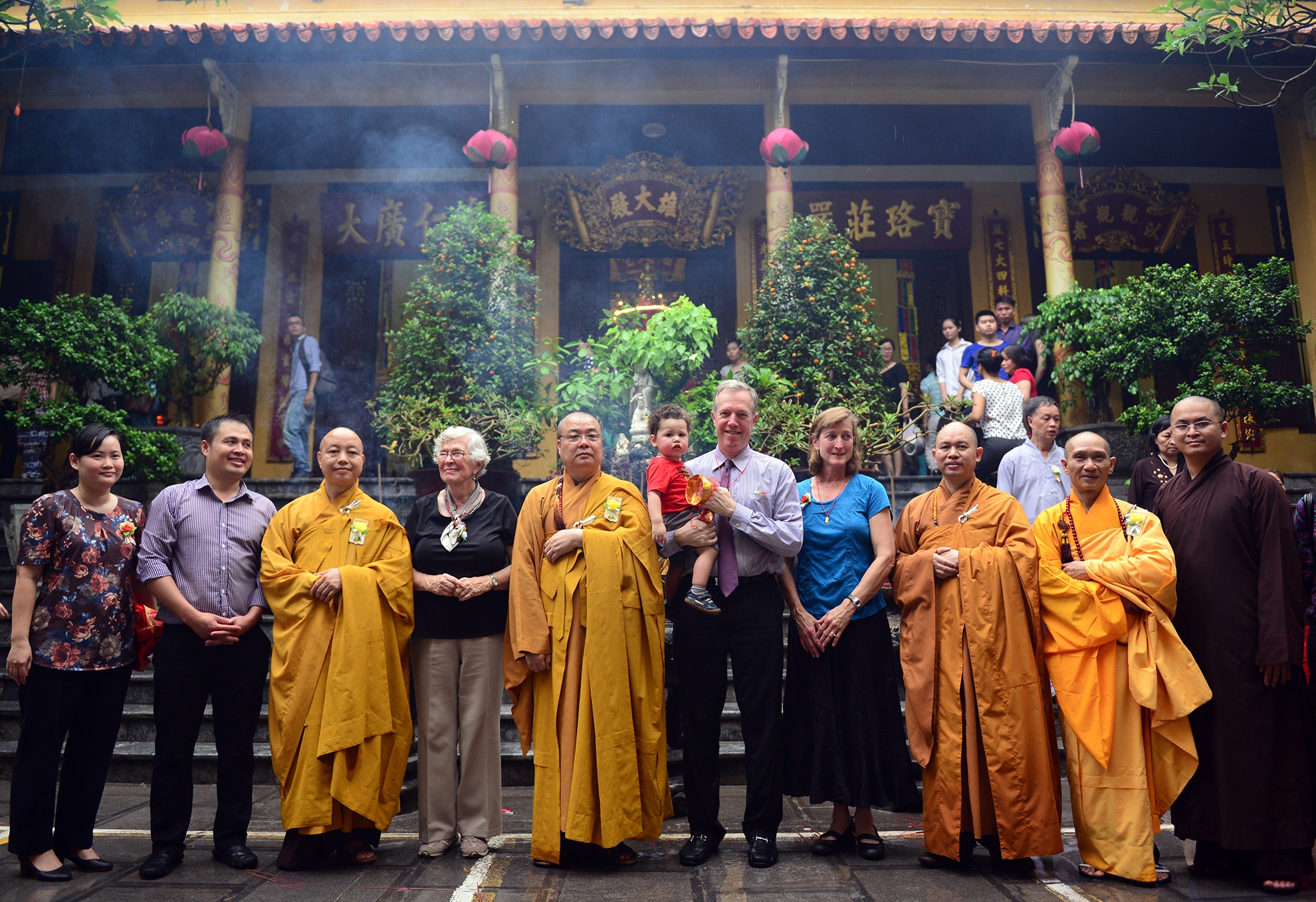 Ông Ted Osius thắp hương lên bàn thờ Phật. Ngoài những điều phúc lành cho gia đình Đại sứ, các sư thầy còn cầu cho thế giới hòa bình, nhân sinh an lạc và các nạn nhân chiến tranh được siêu sinh, tịnh độ. Ngoài ra, tăng ni còn cầu cho tình hữu nghị giữa nhân dân Việt Nam và Mỹ được vẹn toàn.