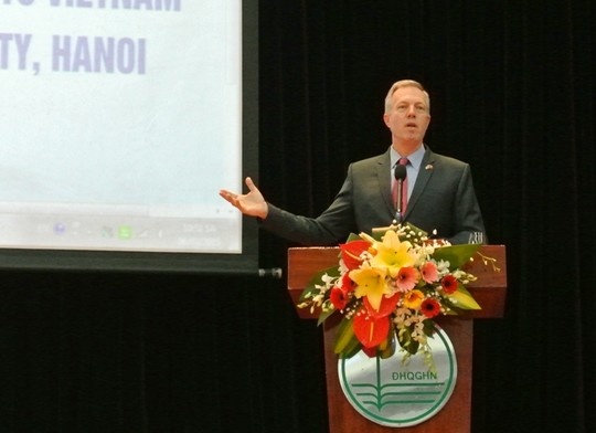 "Với câu nói đó, Chủ tịch Hồ Chí Minh biết rằng hội nhập quốc tế và các quan hệ đối tác dài lâu là rất quan trọng đối với thành công của Việt Nam. Thật phù hợp là tôi nói chuyện về tương lai của quan hệ Việt Nam - Mỹ tại trường Đại học Quốc gia Hà Nội, bởi vì các bạn biết rằng giáo dục nghĩa là học hỏi lẫn nhau. Nghĩa là hiểu nhau để đạt được những lợi ích chung hiệu quả hơn. Nghĩa là nâng cao vị thế cho nhau bằng sự hiểu biết. Nghĩa là giúp nhau khai thác tối đa tiềm năng của chúng ta. Nghĩa là cùng thúc đẩy một tầm nhìn chung về một thế giới hoà bình và công bằng hơn". Chia sẻ của Đại sứ đã nhận được những tràng pháo tay tán thưởng của mọi người có mặt trong khán phòng.
