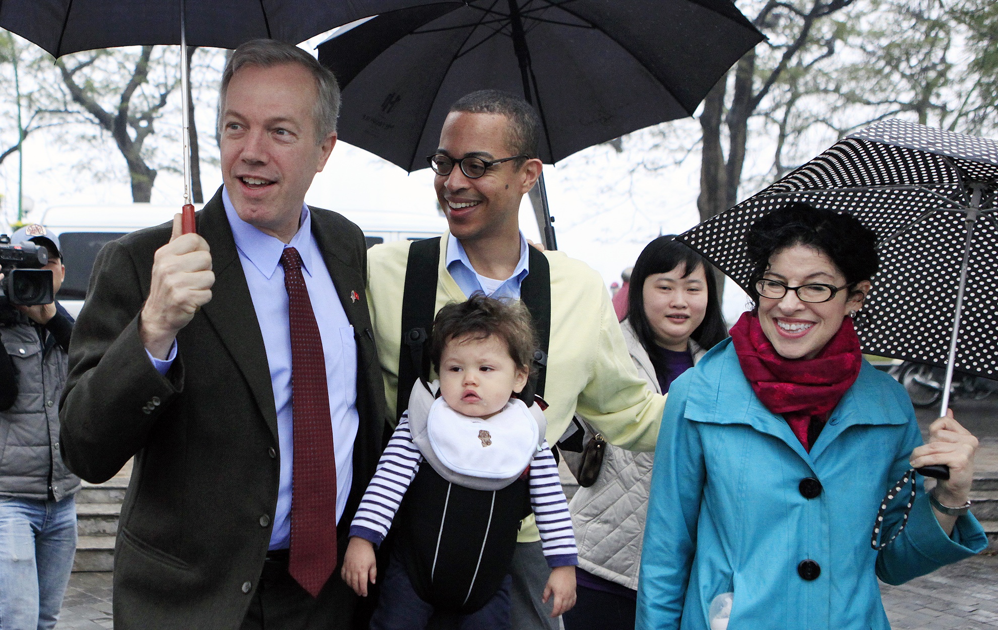 Đi cùng ông Osius tới Hồ Tây là người bạn đời Clayton Bond (áo vàng) và cậu con trai Theodore Alan Bond-Osius. Vị Đại sứ vừa nhậm chức của Mỹ tỏ ra khá am hiểu phong tục tập quán người Việt Nam, nơi ông tới làm việc nhiều lần từ năm 1996. |