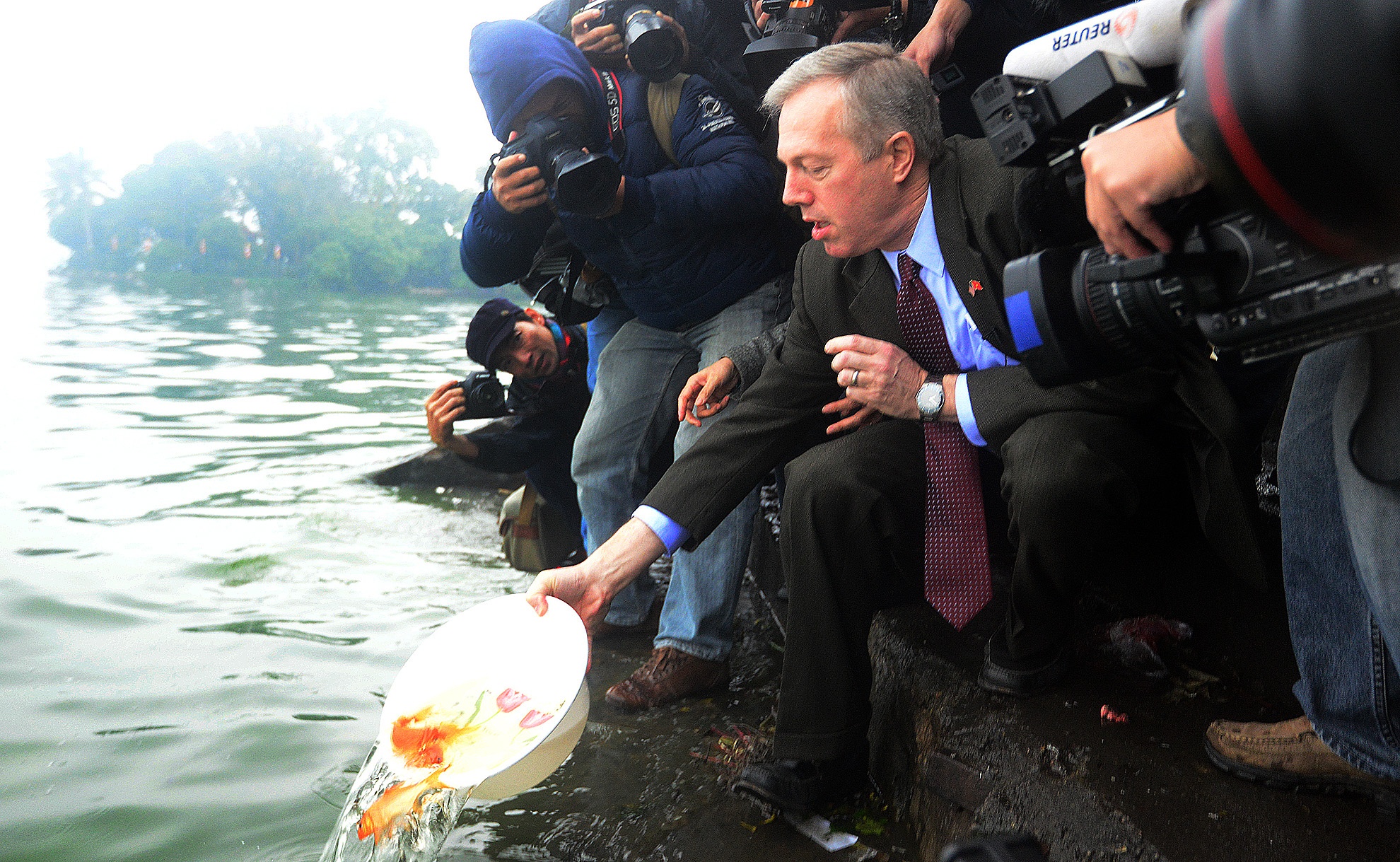 | Đại sứ Osius thả ba con cá chép vàng xuống Hồ Tây theo phong tục tập quán của người Việt. |