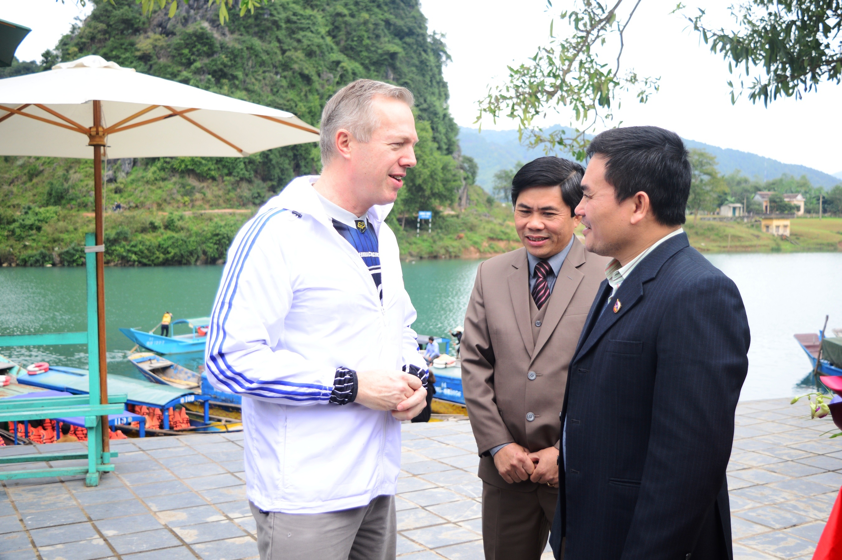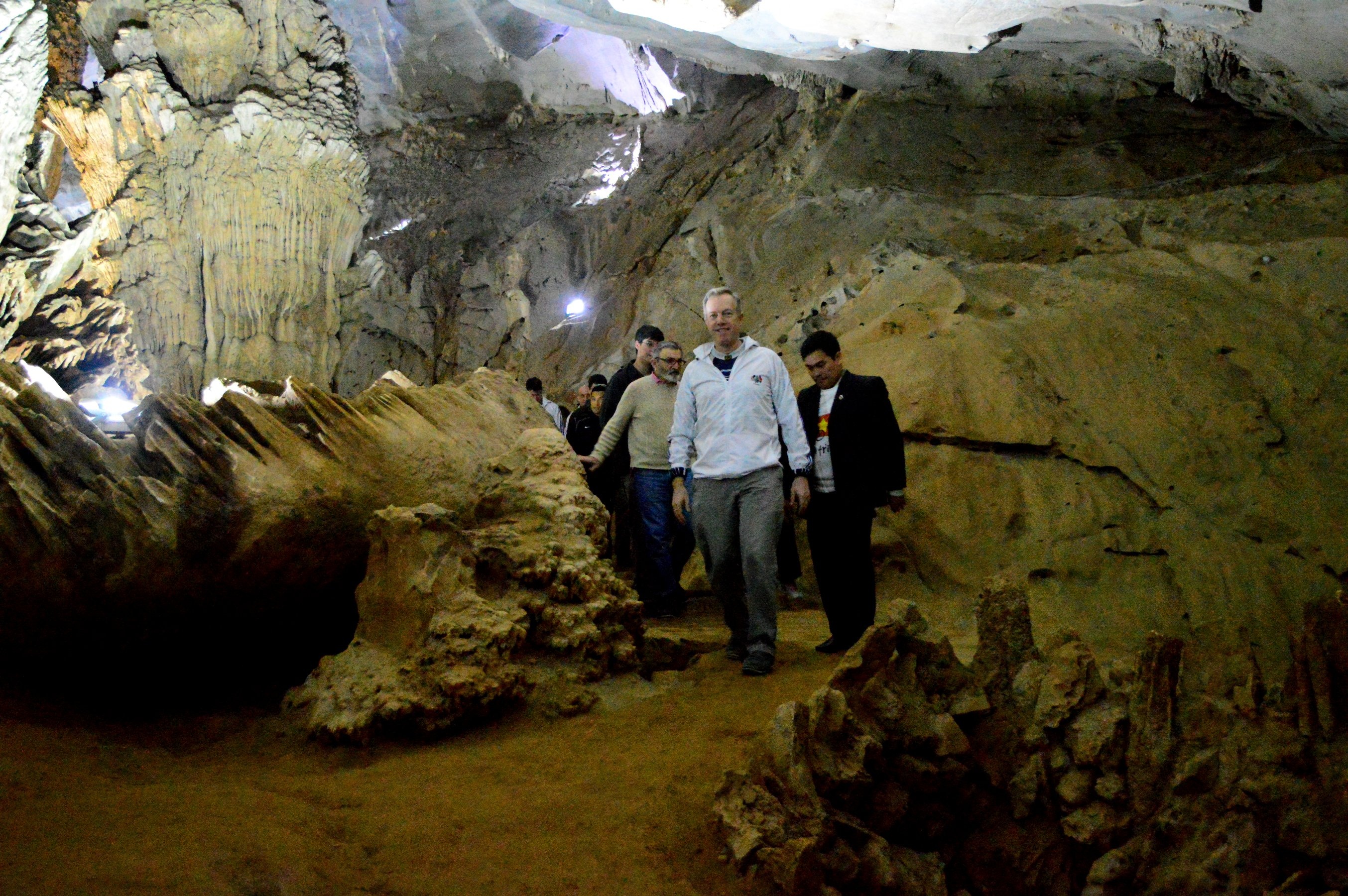 Ngồi thuyền vào tham quan 1.200 m động Phong Nha, đại sứ Mỹ đi bộ lên động Tiên Sơn, sau đó đi thuyền về lại khách sạn.
