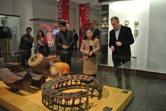 | Cả đoàn tham quan các nhạc cụ trong phần trưng bày về nghệ thuật biểu diễn các nước ASEAN. |