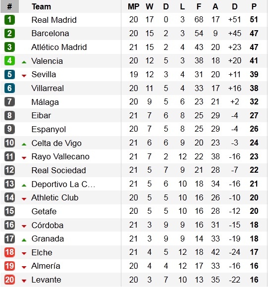 | Bảng xếp hạng vòng 21 La Liga 2014/15. |