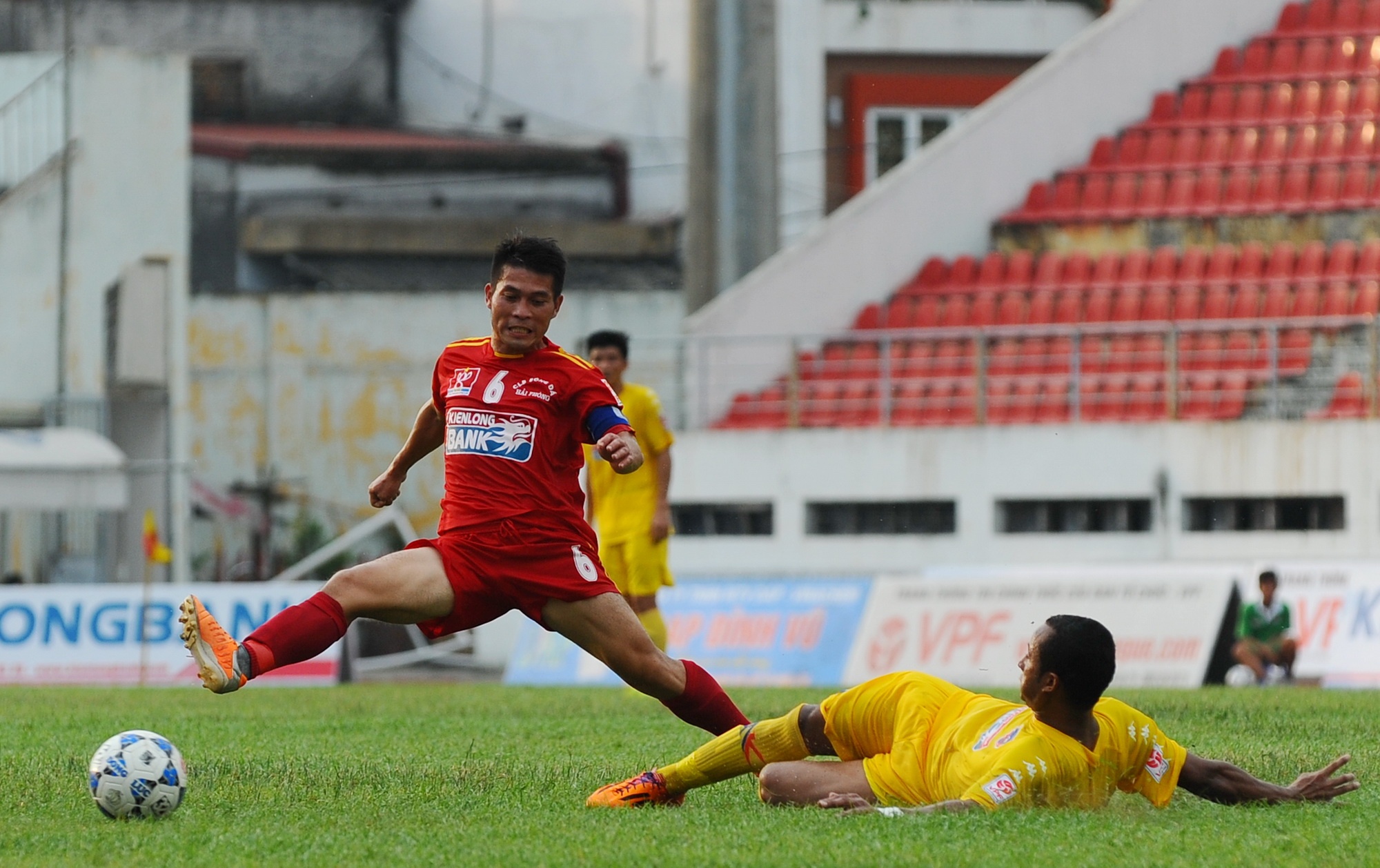 | Đội trưởng Đinh Thanh Trung nổ lực thi đấu vực dậy tinh thần các cầu thủ QNK Quảng Nam nhằm tìm kiếm bàn rút ngắn tỷ số. |