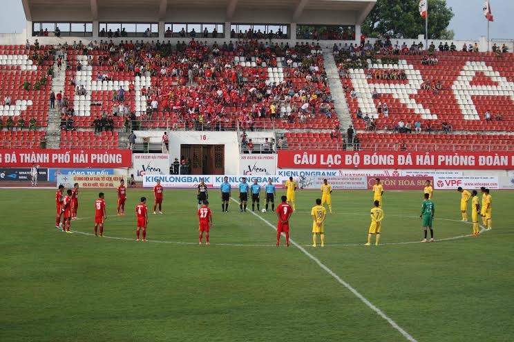 | Cầu thủ 2 đội Hải Phòng, Quảng Nam cùng khán giả có mặt trên SVĐ Lạch Tray dành một phút tưởng niệm cựu danh thủ Phạm Huỳnh Tam Lang. |