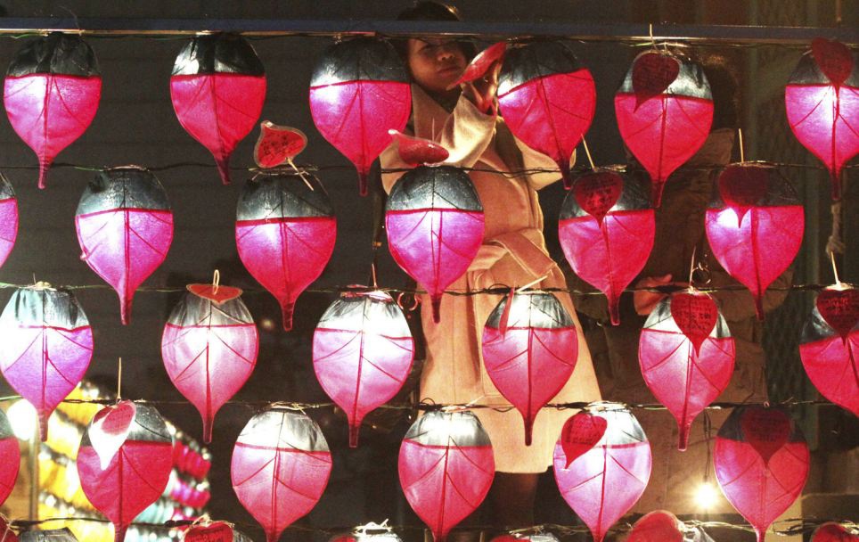 | Một phụ nữ dán những tấm giấy ghi tên mình lên đèn lồng cầu mong năm mới an lành tại một ngôi đền ở Seoul, Hàn Quốc. Ảnh: Daily Mail. |