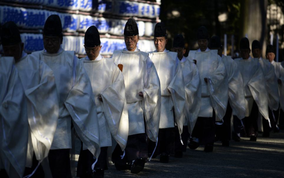 Các mục sư thực hiện nghi thức chào đón năm mới tại đền Meiji ở Tokyo, Nhật Bản. Khoảng 3 triệu người đến thăm ngôi đền này vào những ngày đầu tiên của năm mới để cầu sức khỏe, hạnh phúc và thịnh vượng. Ảnh: EPA.