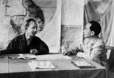 Đại tướng Võ Nguyên Giáp báo cáo tình hình chiến dịch Điện Biên Phủ với Chủ tịch Hồ Chí Minh