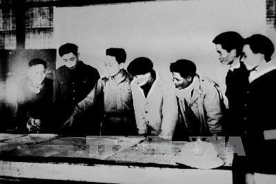 Bác Hồ và Đại tướng Võ Nguyên Giáp cùng bộ chủ huy chiến dịch tại lán chỉ huy