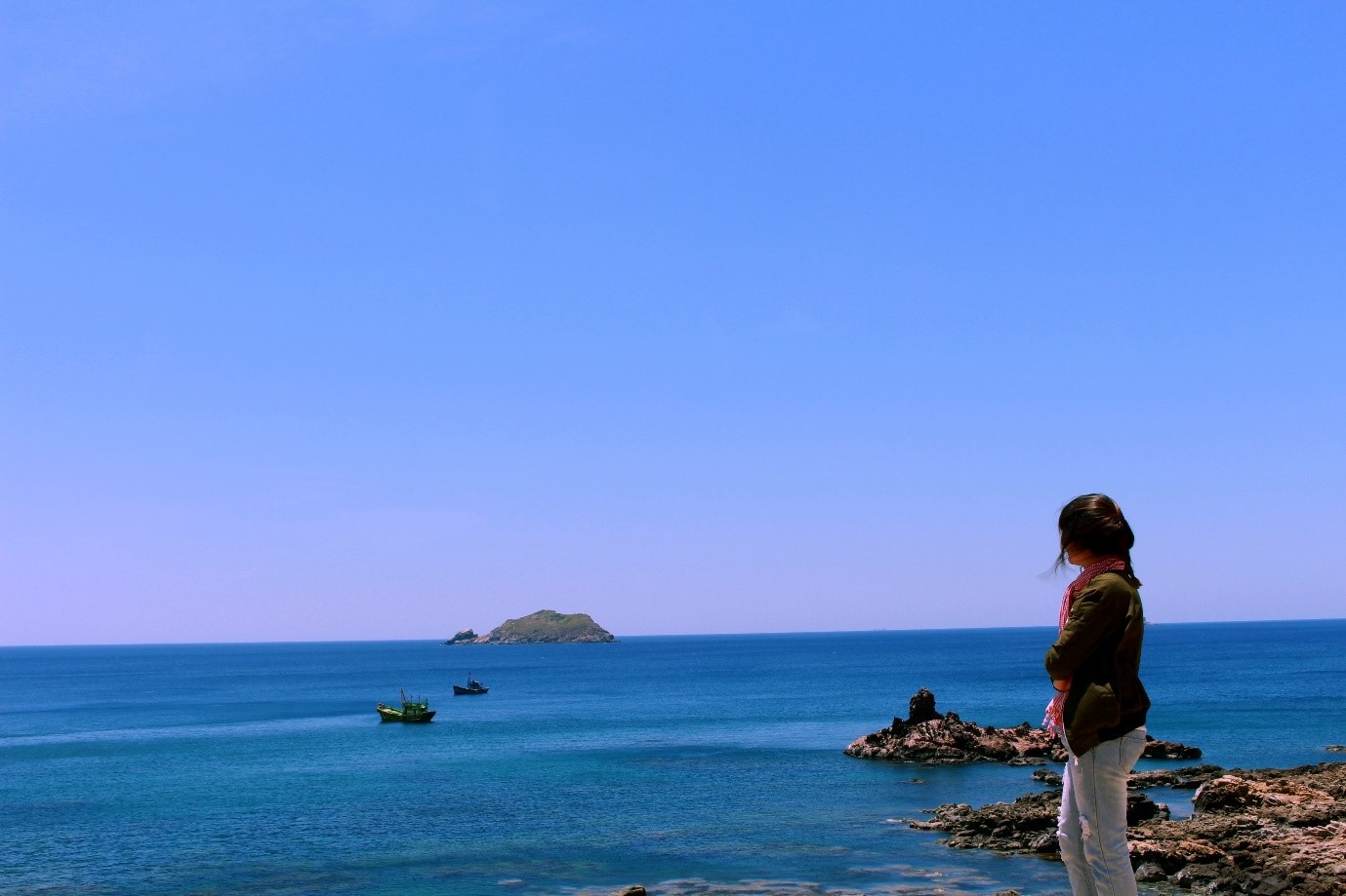 | Sau khi ăn sáng, uống cà phê xong, bọn mình dùng xe máy của chú để đi tham quan một vòng quanh đảo, trên những con đường ngoằn nghèo, là những khung cảnh tuyệt vời nhất. Sự hòa quyện giữa biển và trời. Mọi thứ như là thiên đường vậy. Đi khoảng 1 tiếng là sẽ hết đảo thôi.