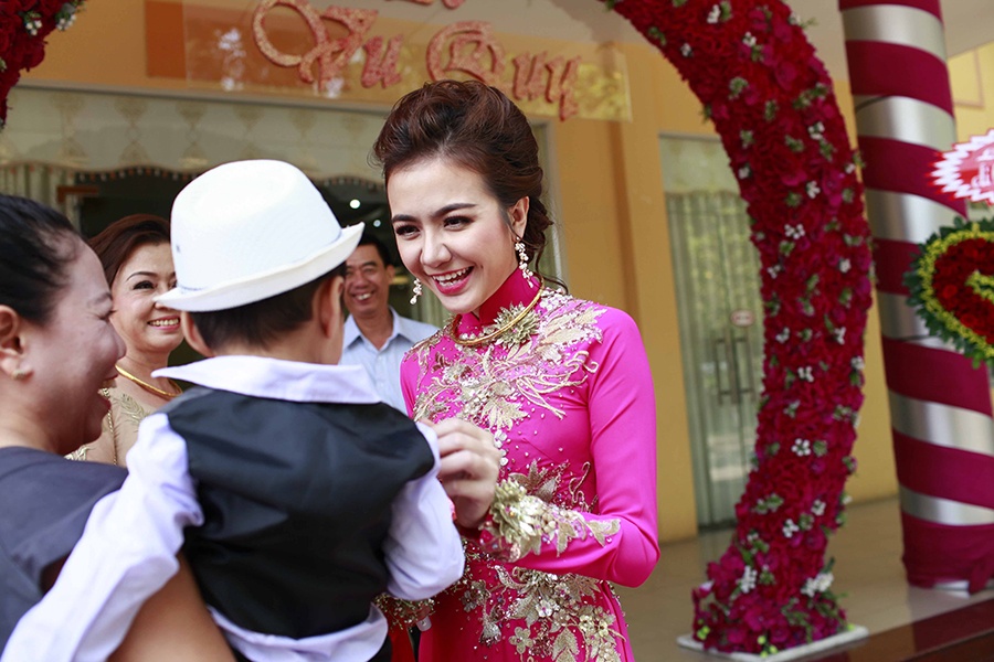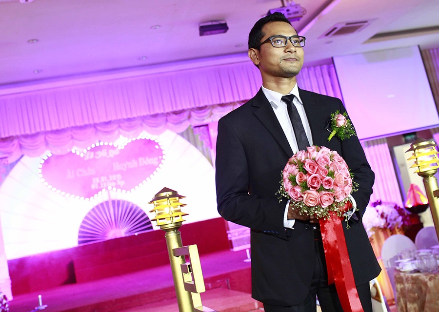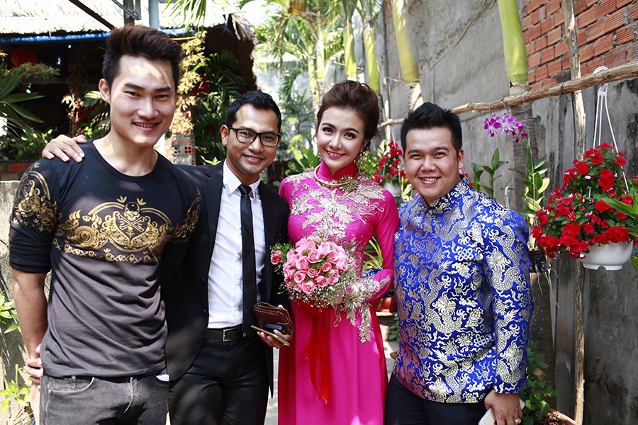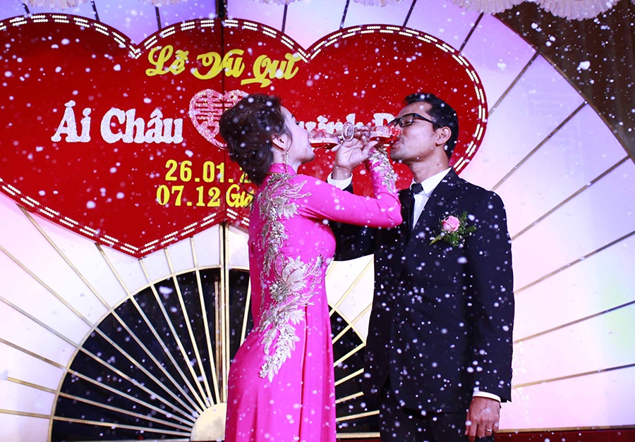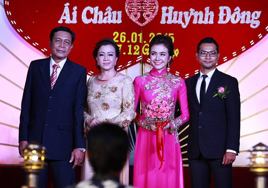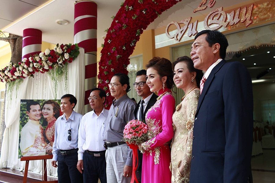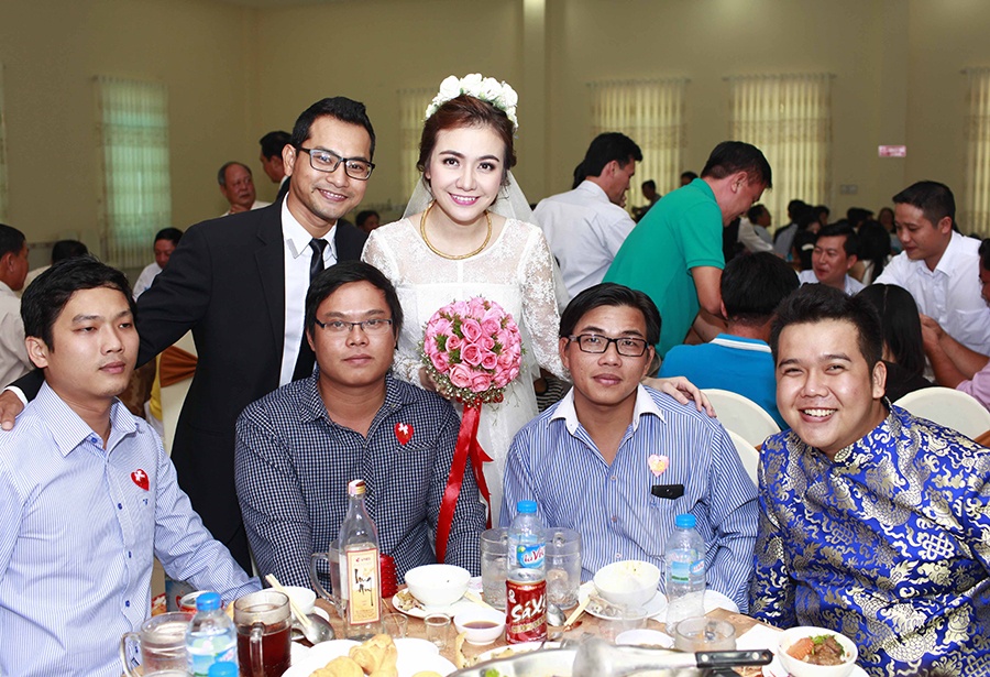 | Chú rể Huỳnh Đông nói lời cám ơn sâu sắc đến bạn bè, đồng nghiệp đã dành thời gian tham dự đám cưới của anh và bà xã. Sau lễ cưới tại Long An, cặp đôi gấp rút trở về Sài Gòn để kịp thời gian tổ chức lễ rước dâu vào sáng 27/1 và đãi tiệc vào buổi tối cùng ngày. |