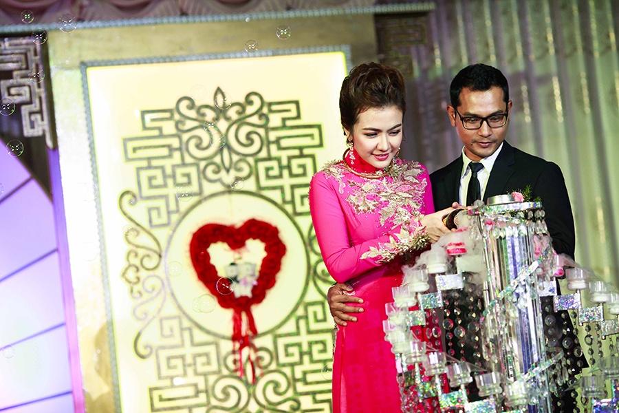 | Nam diễn viên đỡ tay vợ mới cưới cắt bánh kem trước sự cổ vũ của hai họ nhà trai, nhà gái. |