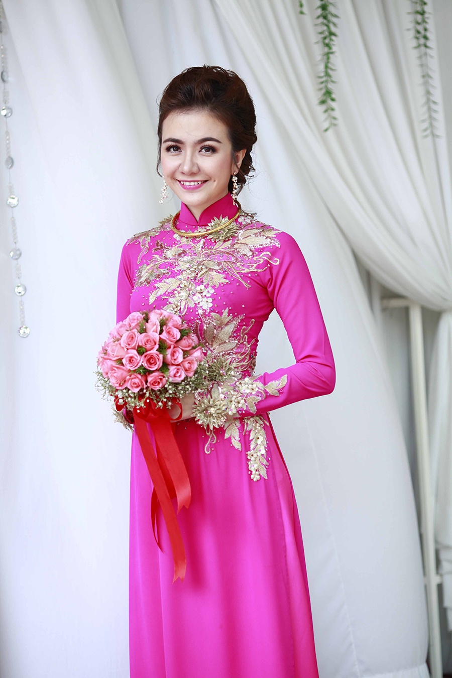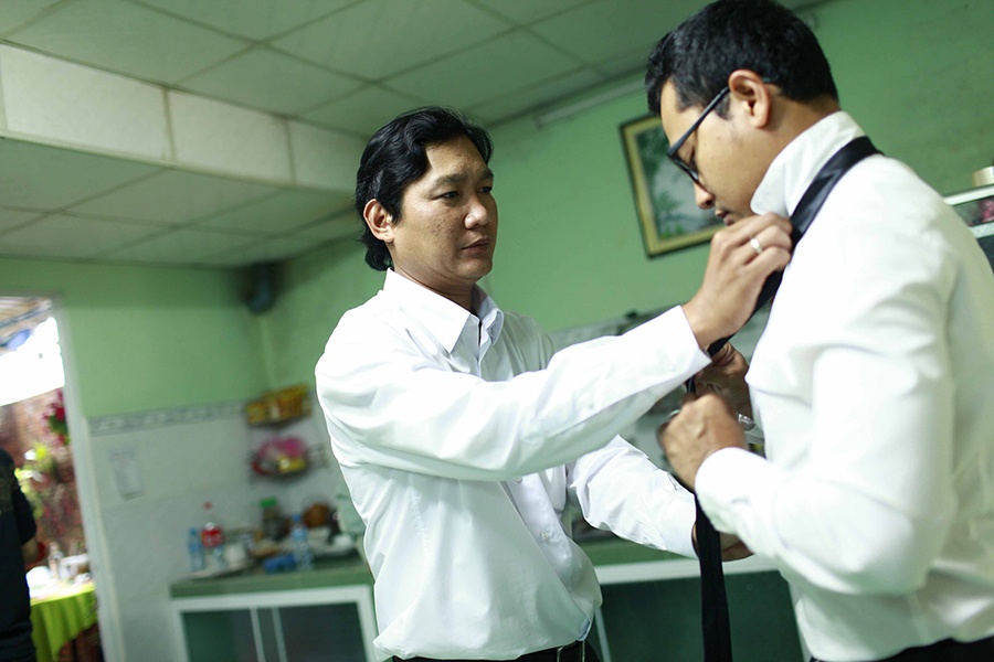 | Để chuẩn bị hôn sự diễn ra chu toàn, cặp đôi có mặt ở Long An từ nhiều ngày trước. Sáng sớm ngày 26/1, cô dâu Ái Châu đã được trang điểm kỹ lưỡng, chuẩn bị trang phục xuất hiện trong tiệc cưới lúc 11h tại một nhà hàng trong thành phố. |