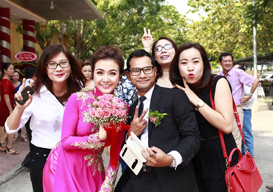 | Cặp tân lang tân nương vui vẻ chụp ảnh cùng bạn bè thân thiết. |