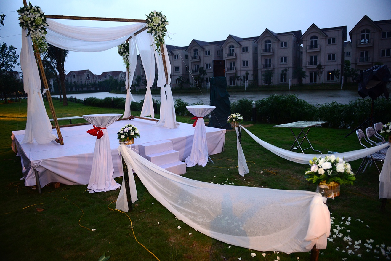 | Tuy nhiên, vào lúc 18h, một cơn mưa lớn bất ngờ ập đến khiến nhân viên phải nhanh chóng thu dọn, cất gọn đồ đã chuẩn bị cho đám cưới. |