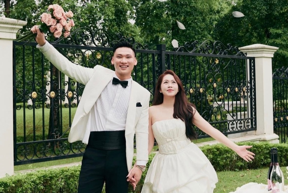 Thủ thành Xuân Hoàng và vợ trong bộ ảnh cưới công bố hồi tháng 9. |