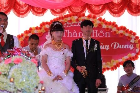 | Nhiều vòng vàng ở tay, cổ cô dâu, chú rể. |