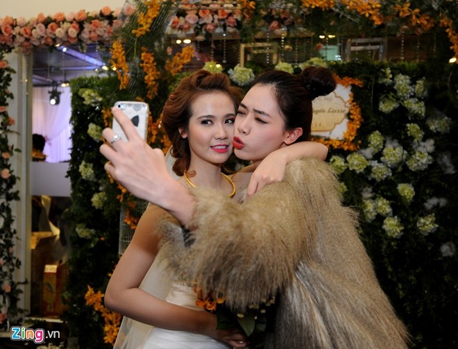 | Hot girl Hà Min tạo dáng trước ống kính cùng cô dâu mới trong lễ thành hôn. Ảnh: Hoàng Anh. |