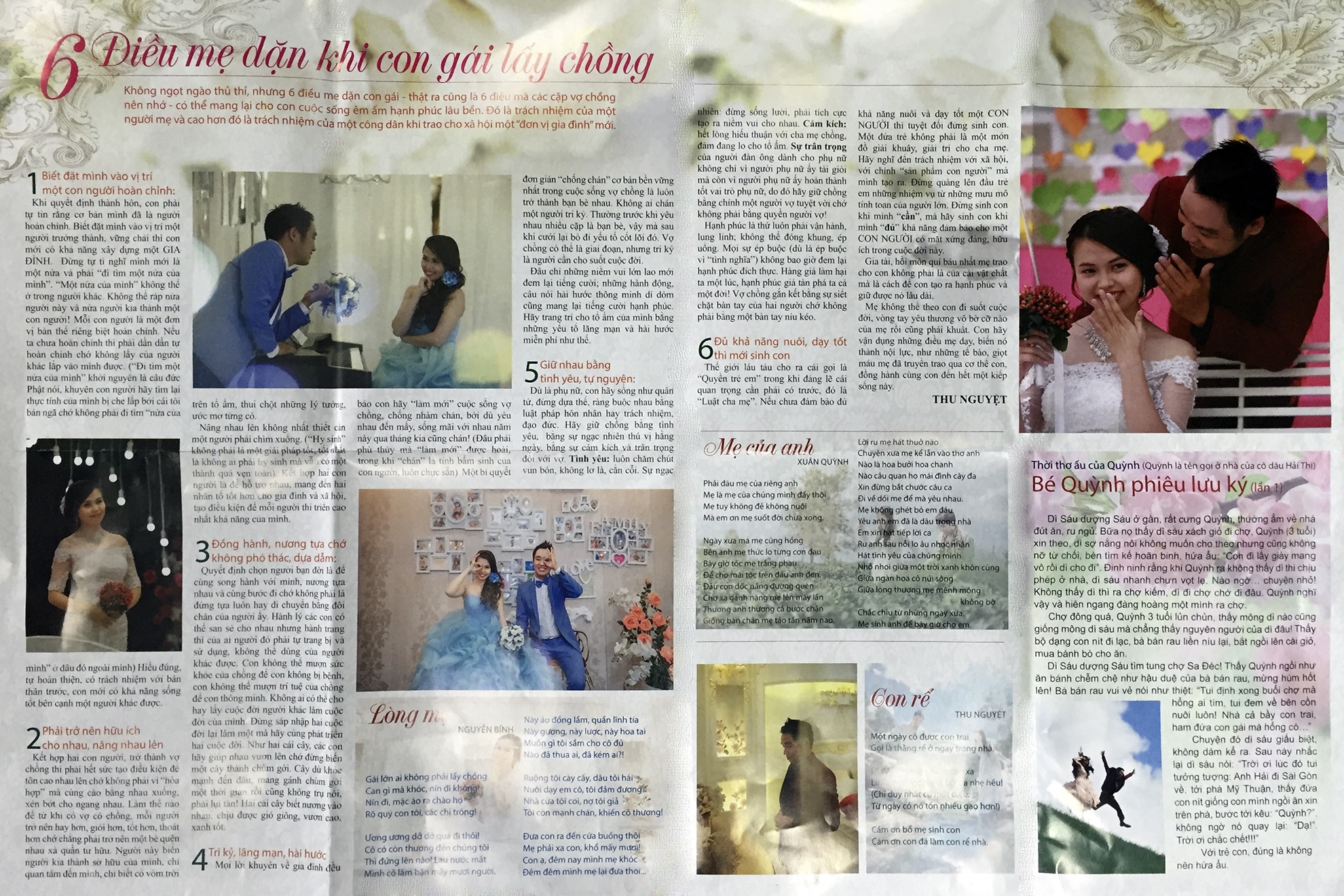 Nội dung hai mặt trang tiếp theo của thiệp mời là bài viết 6 điều mẹ dặn khi con gái lấy chồng, một số bài thơ, hành trình thời thơ ấu của Quỳnh (tên gọi ở nhà của Hải Thi).