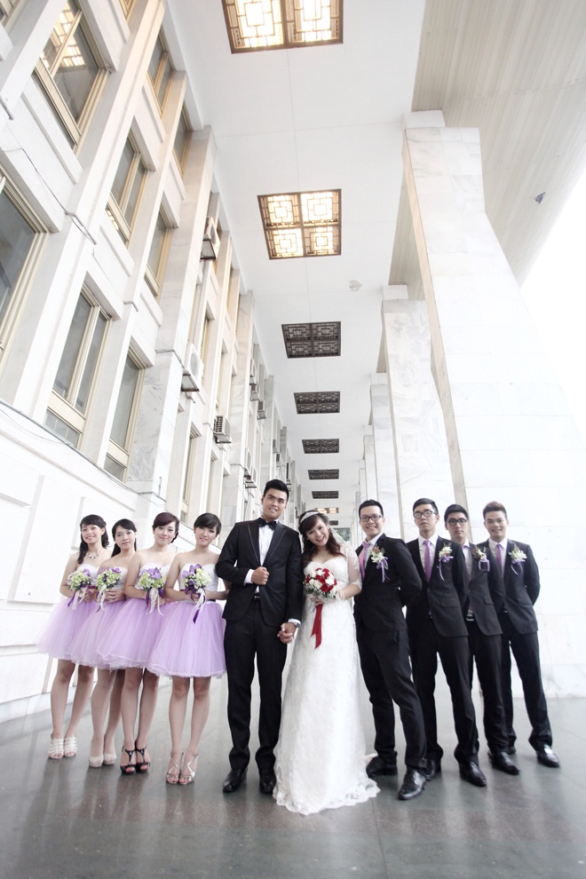 Cô dâu chú rể tạo dáng xì tin bên dàn phù dâu - phù rể.