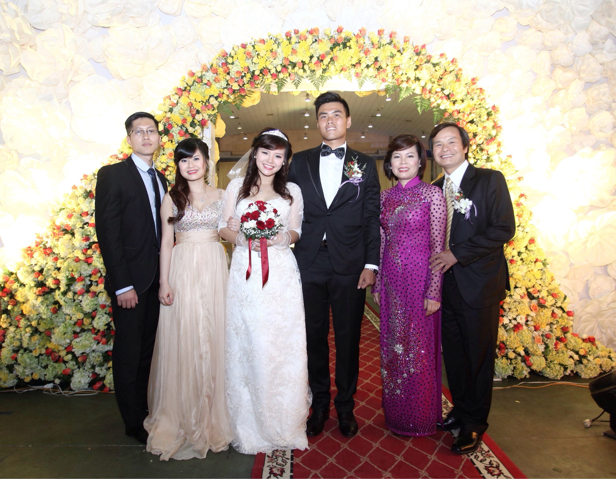 Cô dâu chú rể hạnh phúc bên bố mẹ hai bên. Dù gia đình có điều kiện nhưng chú rể Ngọc Vũ không dựa vào ba mẹ mà đã sớm tự lập trong chuyện kiếm tiền cũng như xây dựng sự nghiệp của mình. Hiện tại, bên cạnh việc thi đấu tại các giải tennis lớn nhỏ hay làm HLV cho lứa VĐV trẻ cũng như người chơi nghiệp dư, Vũ còn quản lý những sân thể thao mà gia đình đầu tư ở Hà Nội.