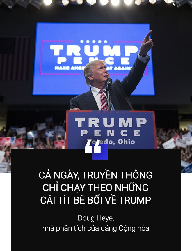 “Cả ngày, truyền thông chỉ chạy theo những cái tít bê bối về Trump... nếu là người khác, và trong bối cảnh khác, thì đã toi rồi... có thể có quá nhiều thứ về ông Trump nên cử tri và chiến dịch của bà Clinton không thể nào tập trung vào một thứ, và như vậy phần nào có lợi cho ông Trump”.