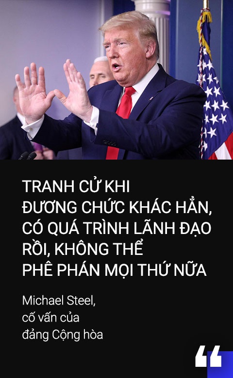 “Tổng thống Trump đang là tổng thống đương nhiệm. Tranh cử khi đương chức khác hẳn, có quá trình lãnh đạo rồi, không thể phê phán mọi thứ nữa”, Michael Steel, cố vấn của đảng Cộng hòa, nói với Politico. Ông nói ứng viên Joe Biden khác với ứng viên Hillary Clinton, và “đại dịch là phép thử lớn nhất về khả năng lãnh đạo của Tổng thống Trump... rõ ràng là ông ấy đang thất bại”.
