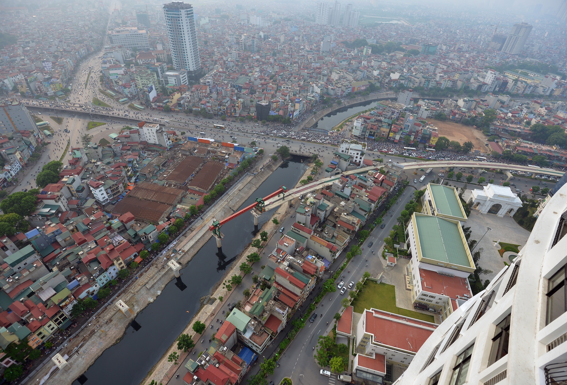 Hình ảnh phiến dầm đầu tiên bắc qua sông Tô Lịch đoạn gần Ngã Tư Sở, tạo thành đoạn đường sắt trên cao lượn cong qua góc một trong những khu đô thị đẹp nhất Hà Nội.