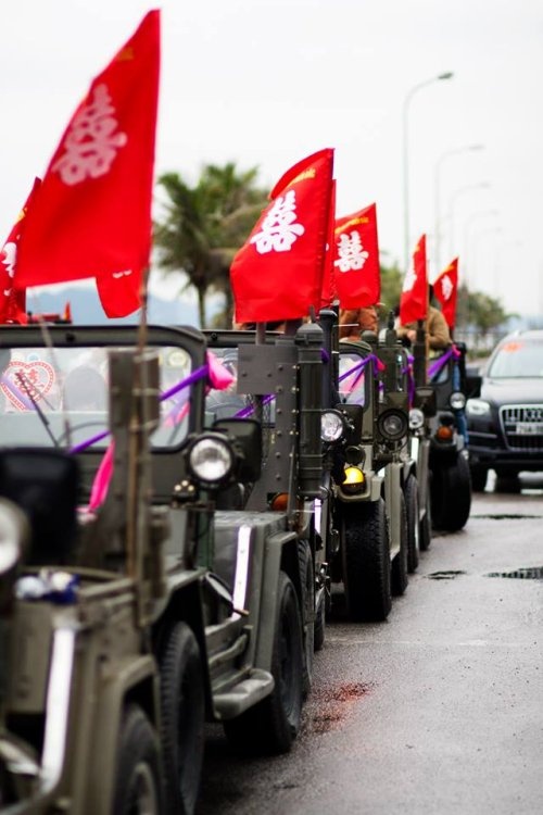 | Những chiếc Jeep mang màu sắc quân sự đã được trang hoàng hoa, dải lụa và chữ “hỷ” để tham gia đoàn rước dâu với nhân vật chính là chiếc “xe hoa” Audi A5 mui trần. Suốt đoạn đường từ Bãi Cháy qua cầu Bãi Cháy sang bên Hòn Gai, đoàn xe đi theo hàng dài nối đuôi nhau thu hút rất đông người đi đường chú ý. Đây là đám cưới con gái một thành viên trong hội chơi xe Jeep tại Quảng Ninh. |