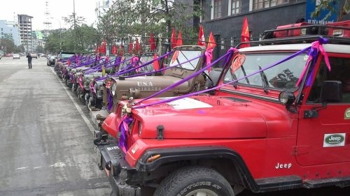 | Đoàn xe có khoảng 13 chiếc xe thuộc thương hiệu Jeep, trong đó có 11 chiếc thuộc dòng M151 A2 (hay còn gọi là Jeep lùn) thường thấy trong cuộc chiến tranh Việt Nam giai đoạn từ thập niên 60 đến 70 của thế kỷ trước; hai chiếc còn lại gồm một Jeep Willy có “tuổi đời” cao hơn (sản xuất năm 1941) và một chiếc Jeep Wrangler 1991. |