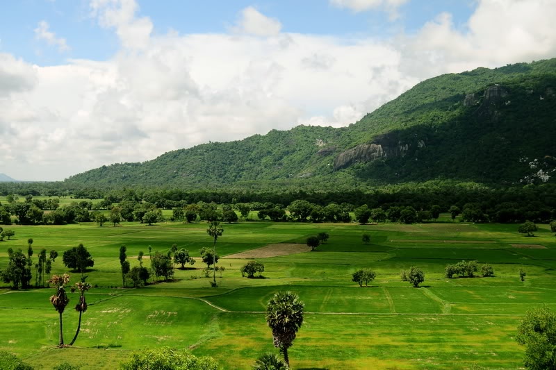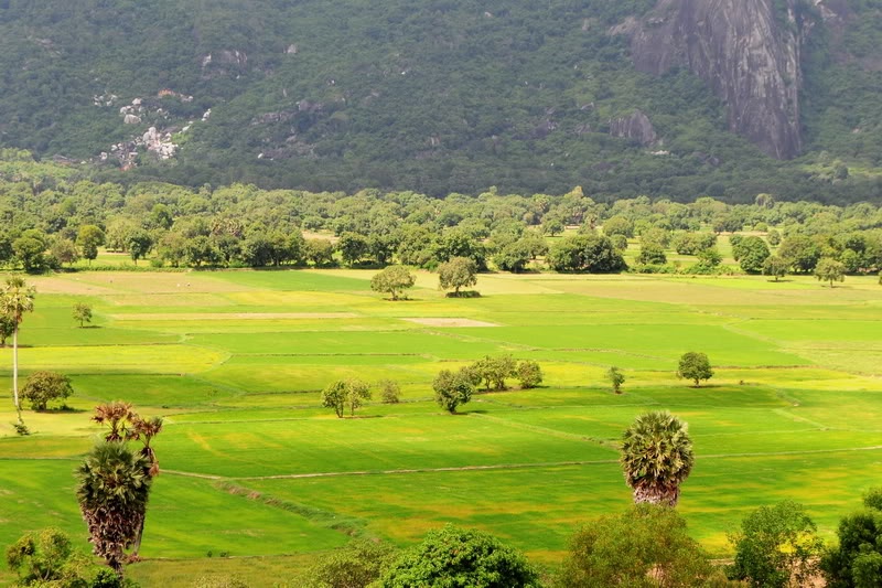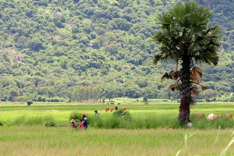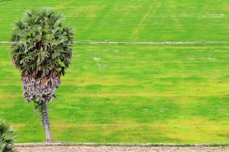 Điểm đến đầu tiên là cánh đồng Tà Pạ (cách thị trấn Tri Tôn khoảng 1 km). Nhìn từ trên cao, Tà Pạ như một tấm thảm xanh ngút ngàn màu lúa non, lác đác điểm tô bằng những ngọn thốt nốt cao vút. Thời diểm chúng tôi đến, Tà Pạ đã qua mùa thu hoạch, và người dân ở đây cũng đã cấy xong vụ mới. Mạ non xanh ngát, tuy nhiên vì quá mới nên chưa xanh đều, chưa bắt mắt…