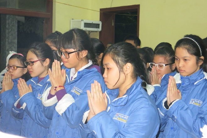| Bạn bè của cháu Trung từ trường THCS Trần Phú đến thắp hương đưa tiễn người bạn cùng trường. |