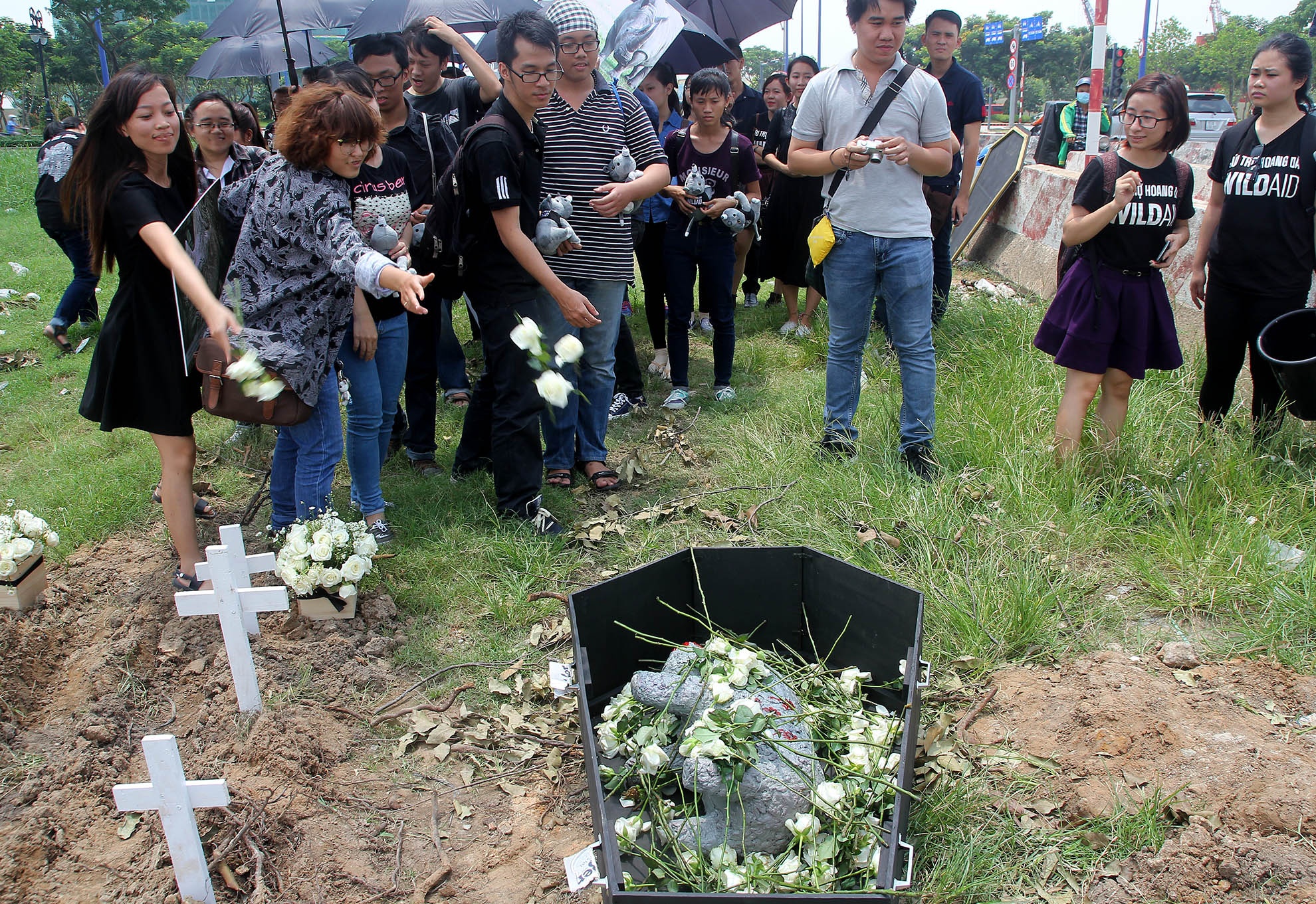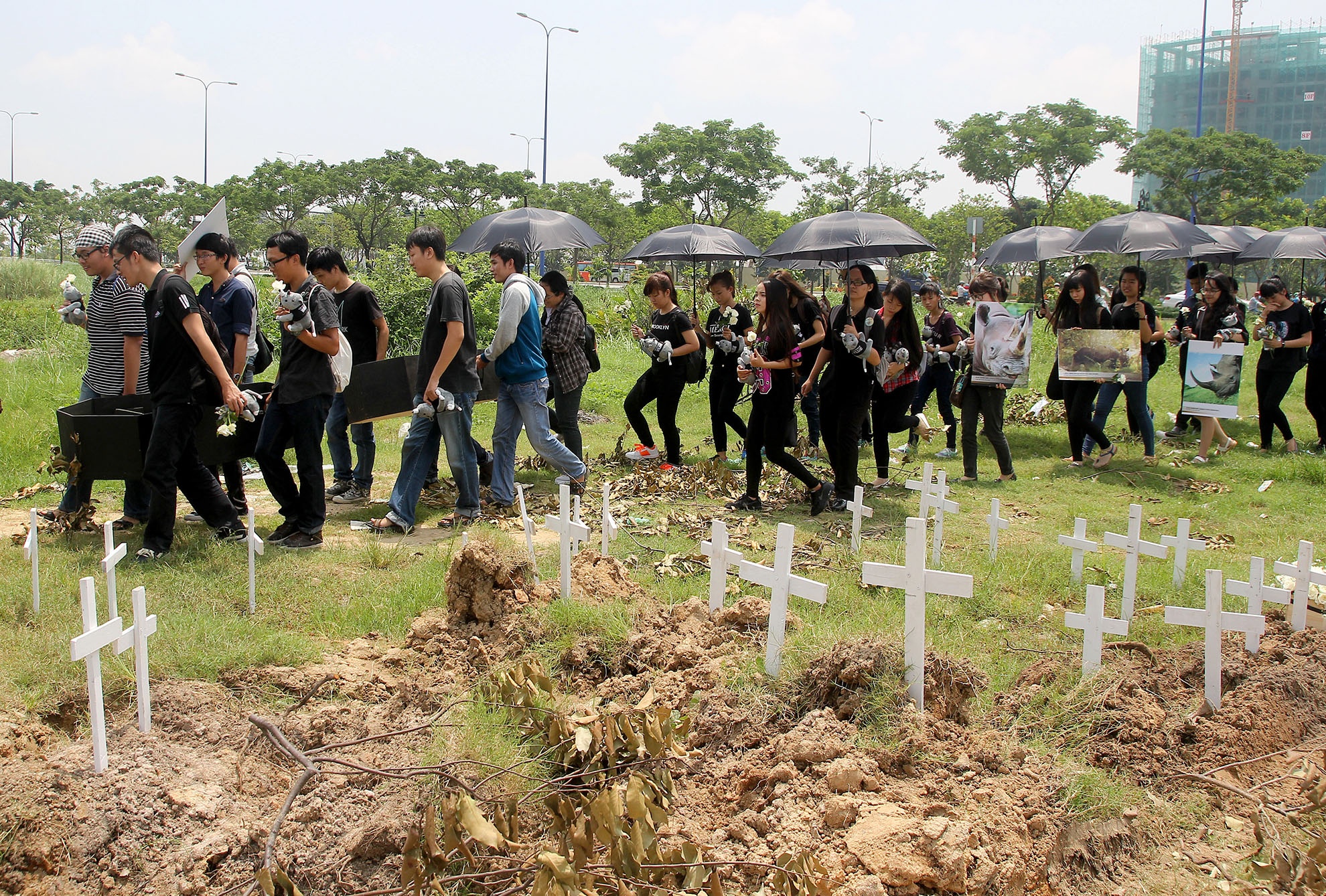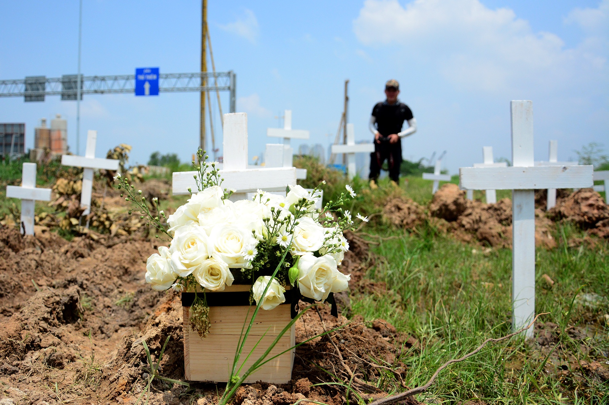 | Tại khoảng đất trống bên đại lộ Mai Chí Thọ (gần cầu Thủ Thiêm, quận 2), nhóm bạn trẻ dựng lên một nghĩa trang tượng trưng với nhiều cây thánh giá với những bó hoa hồng trắng. |