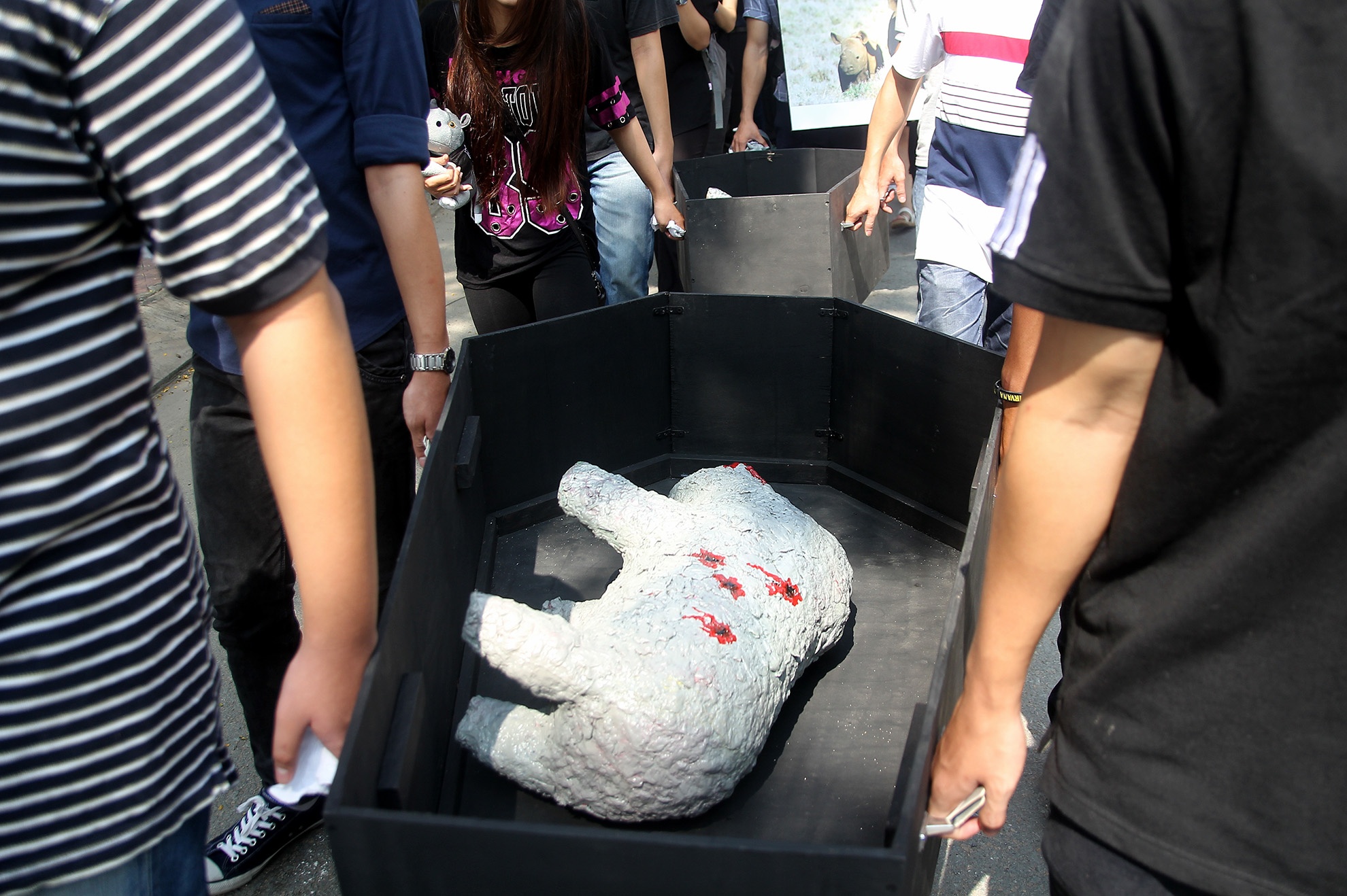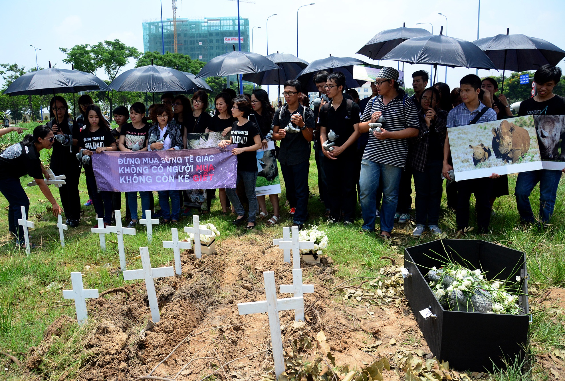 Các bạn trẻ tham gia hoạt động này đã tổ chức một "đám tang" nhằm tưởng nhớ hai mẹ con tê giác sống tại vườn quốc gia Kruger, Nam Phi bị bắn chết giữa tháng 9 vừa qua. Đó là hai hình nộm bằng giấy tái chế tượng trưng cho xác của hai mẹ con tê giác xấu số cho vào "quan tài" và đưa tới nơi chôn.