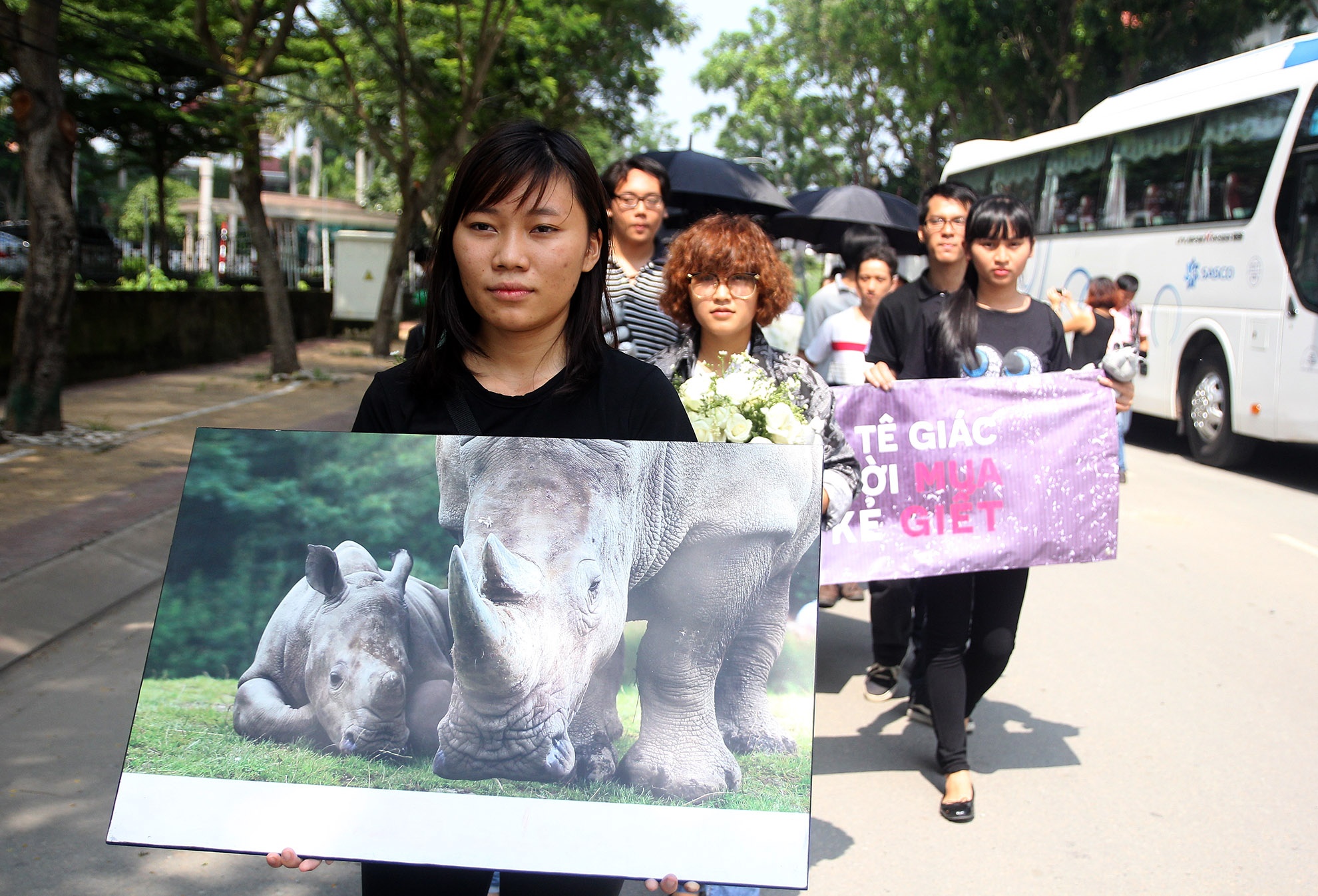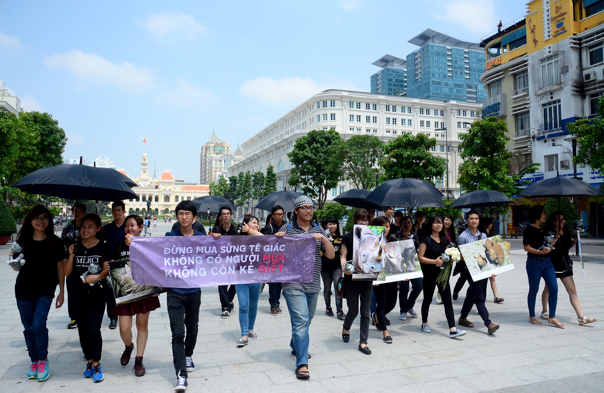 | Các bạn trẻ vừa đi vừa mang theo khẩu hiệu, đồng thanh hô lớn: "Đừng mua sừng tê giác. Không có người mua, không có kẻ giết". |