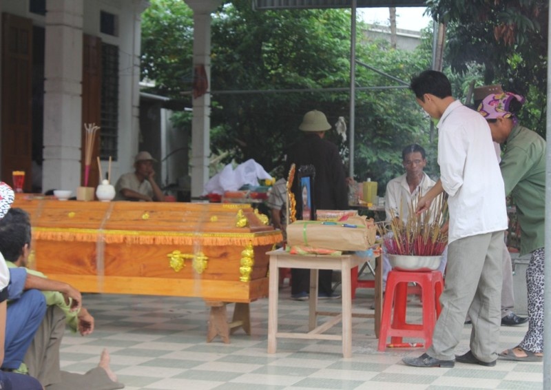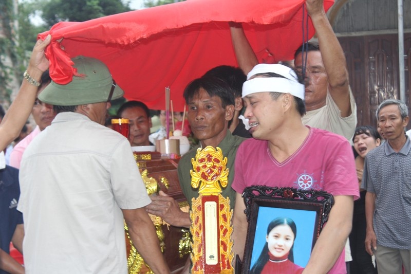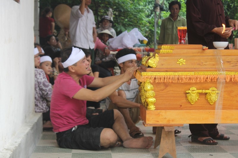 Lễ tang cho mẹ con sản phụ Vinh được làm một cách chóng vánh để kịp đưa ra nghĩa địa trước khi trời tối. Người dân lần lượt vào thắp nén nhang tiễn biệt người xấu số. Hơn 17h, chiếc quan tài cùng dòng người đã đưa tiễn mẹ con chị Vinh về nơi an nghỉ cuối cùng. Nhìn cảnh anh Trường ôm di ảnh người vợ khóc thảm thiết mà nhiều người dù không thân thích cũng phải rơi nước mắt.