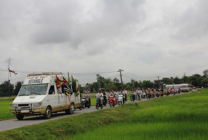 | Dòng người đưa tiễn hai mẹ con chị Vinh dưới bầu trời u ám, mây đen kịt. |