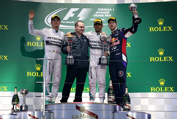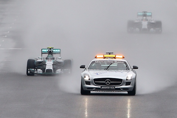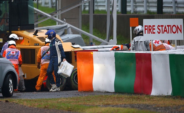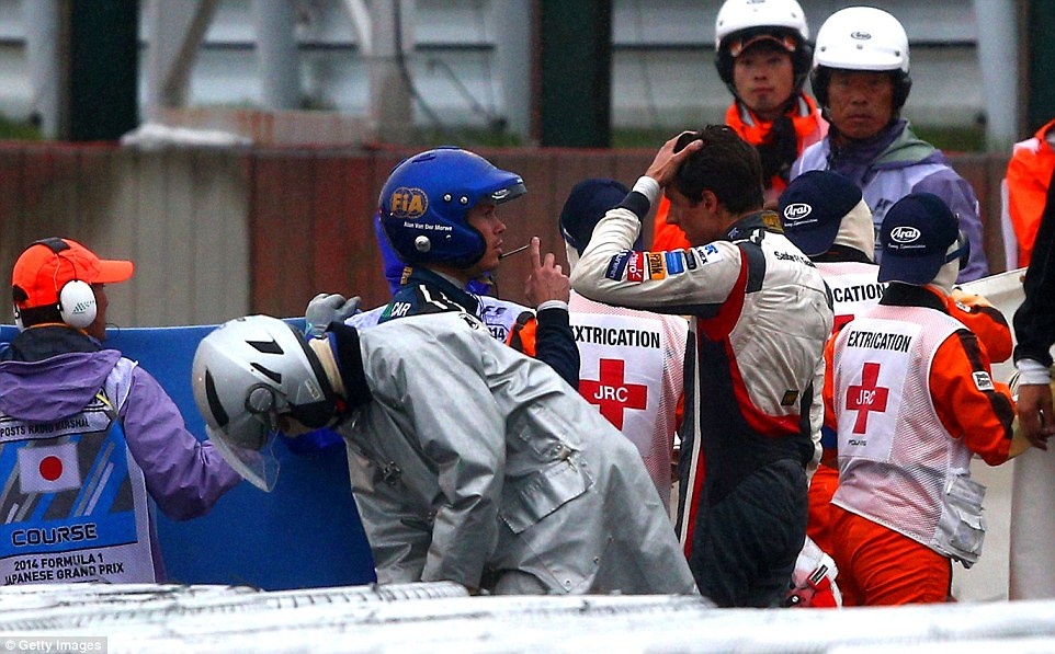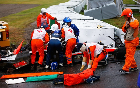 Mặt đường trơn trượt tại trường đua Suzuka khiến Jules Bianchi mất lái, đâm sầm vào chiếc máy kéo đang làm nhiệm vụ và bất tỉnh. BTC quyết định kết thúc cuộc đua trước 10 vòng.